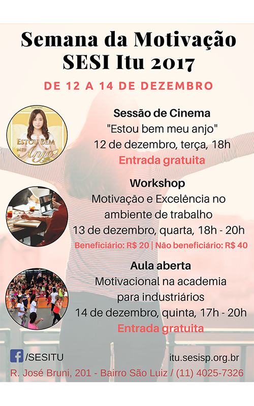 O SESI Itu preparou uma semana especial com diversas atividades relacionadas à motivação e excelência no ambiente profissional e na vida pessoal. Venha encerrar o ano de 2017 em grande estilo!