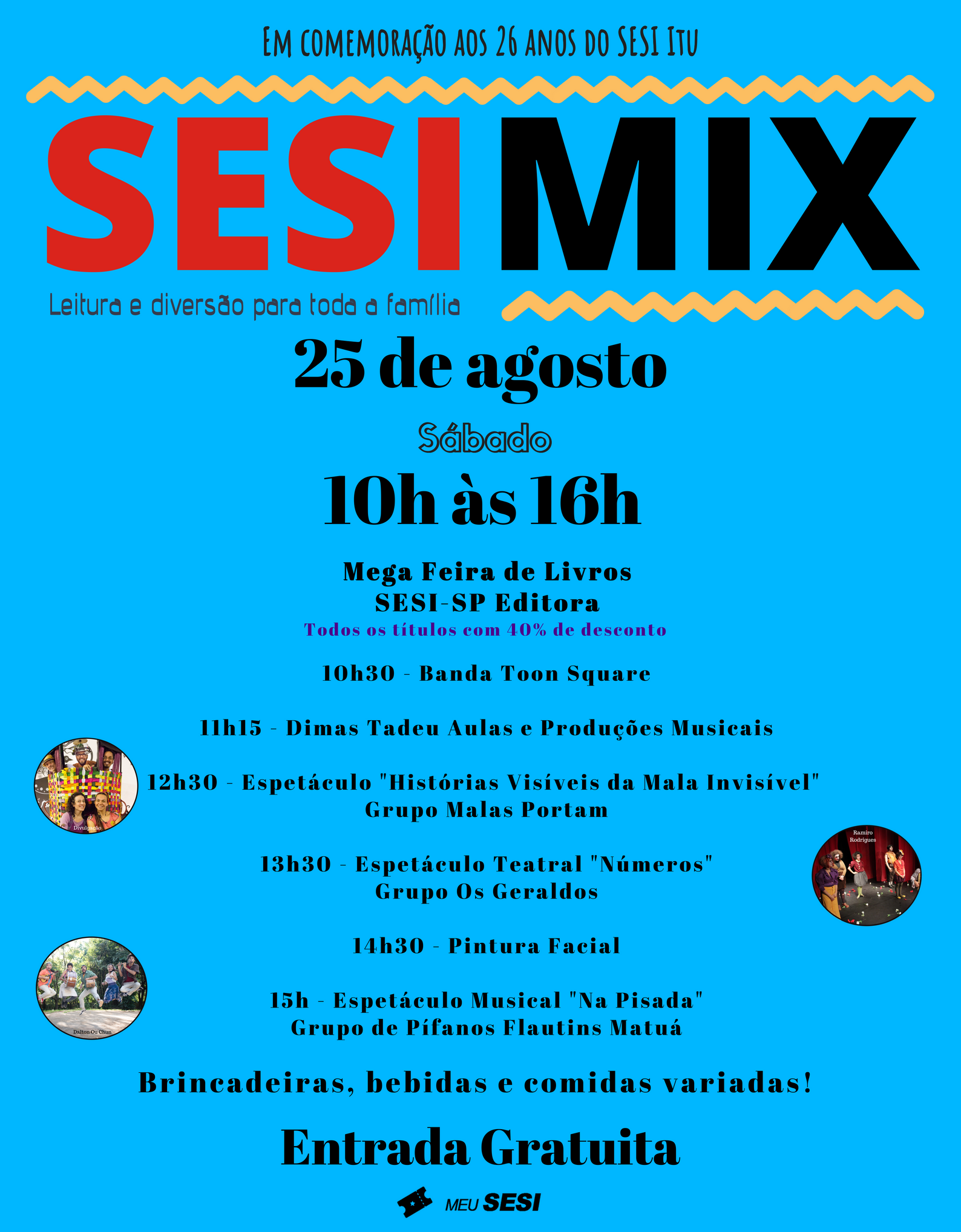 No dia 25 de agosto, sábado, a partir das 10h, acontecerá na unidade de Itu, o SESI MIX - Leitura e Diversão para toda a família que contará com diversas atrações.